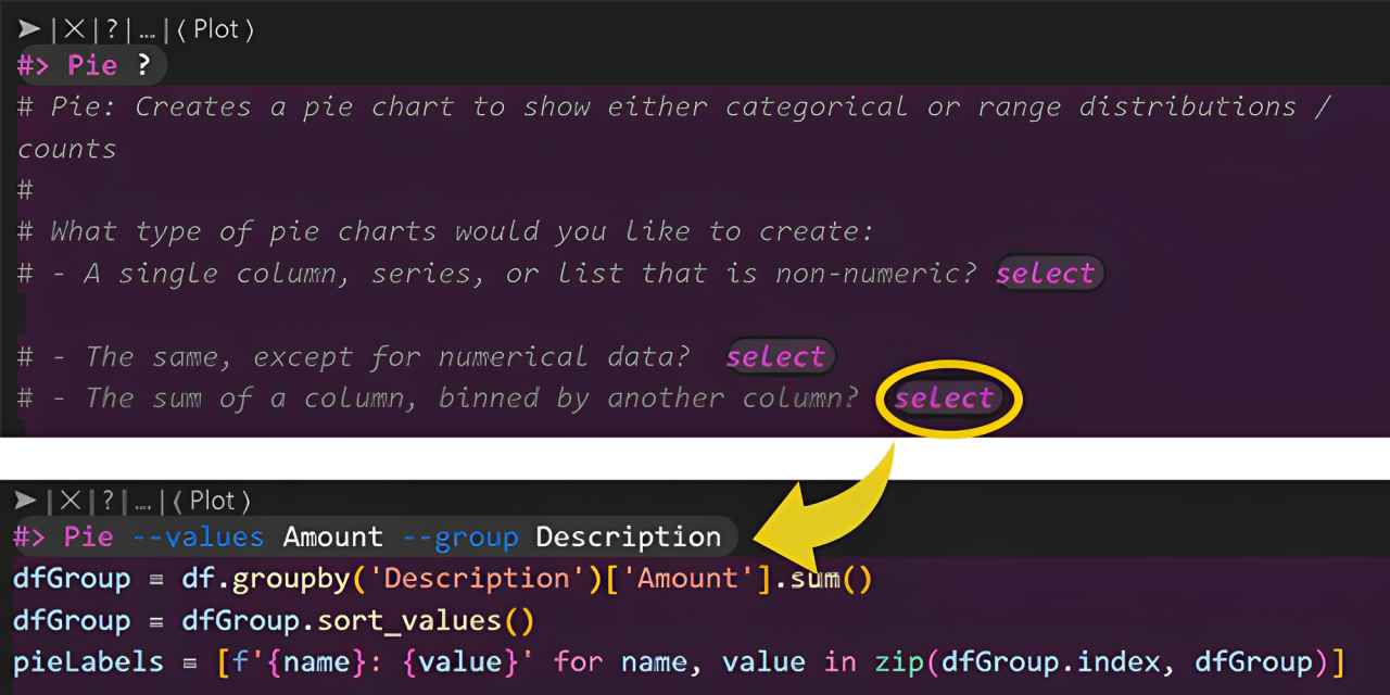 Determine the cause of a slumping pie shop by visualizing profits, filtering to either sales or costs, and using a pie chart to see the business’s primary cost.